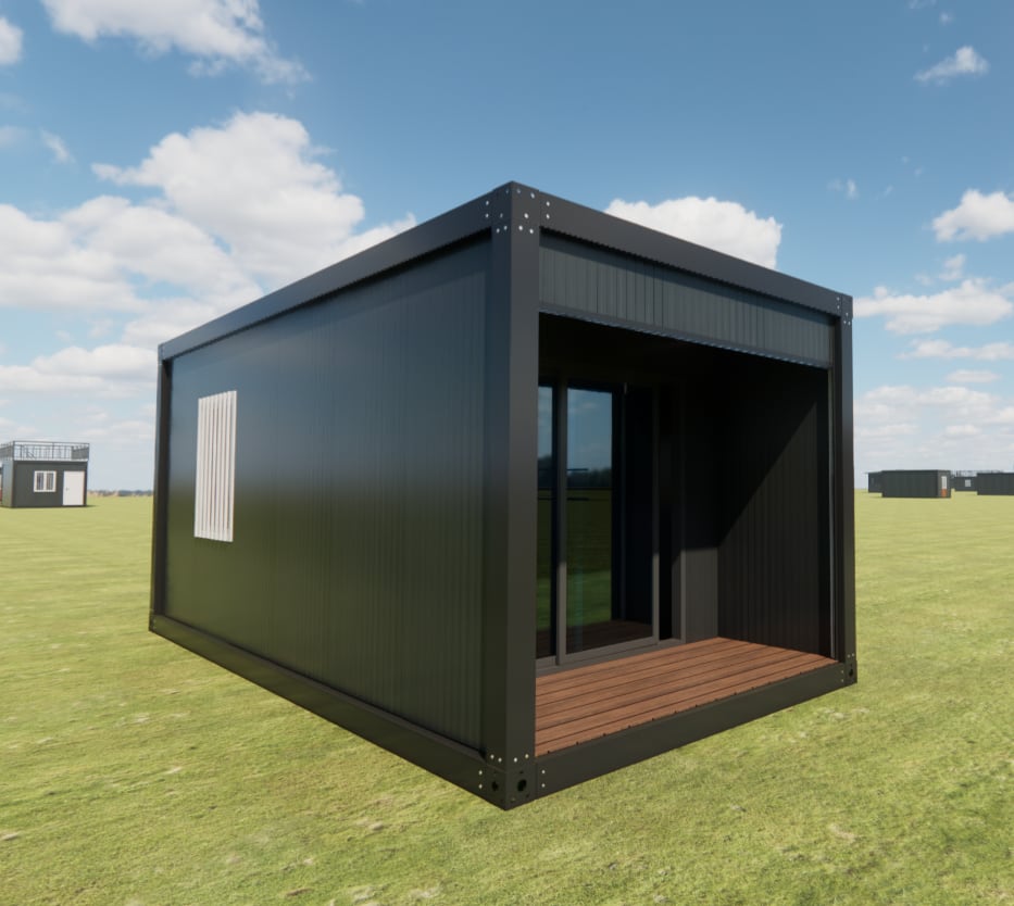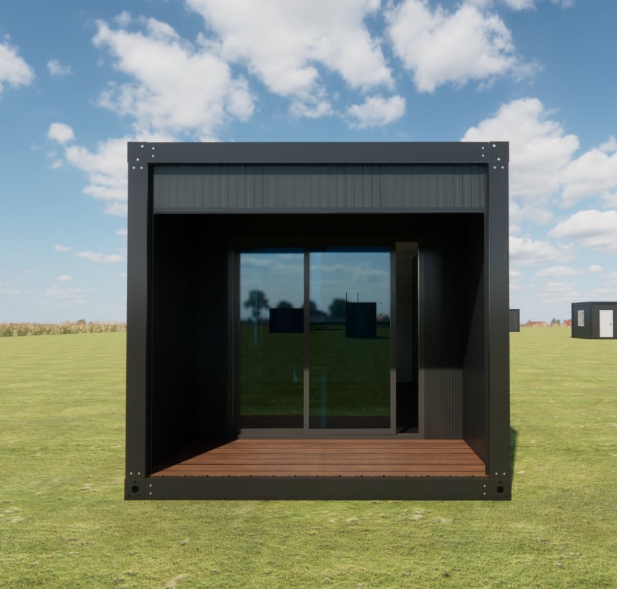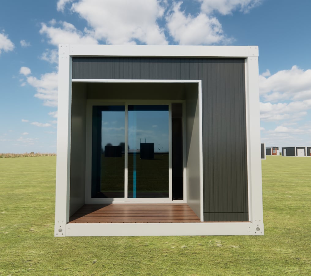[新品・予約商品]玄関ポーチオプション付き 組立式プレハブハウス 18㎡タイプ(サイズ調整可能)ガラス戸付き