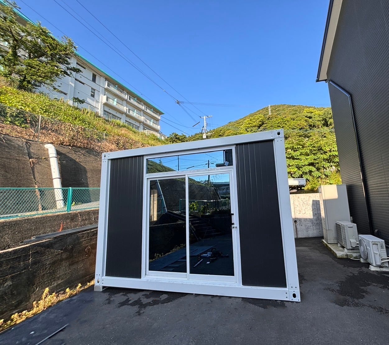 [新品・予約商品] W4000×D3000mm(サイズ・カラー変更可能)出入口ガラス引戸タイプ 白枠×黒壁(色変更可) 現場組立式プレハブハウス ユニットハウス
